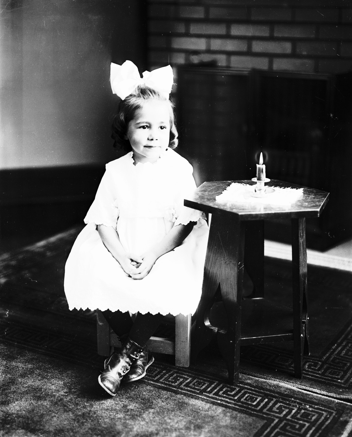- Portrait of a young girl, a big bow in her hair, seated beside a table with a lighted candle.