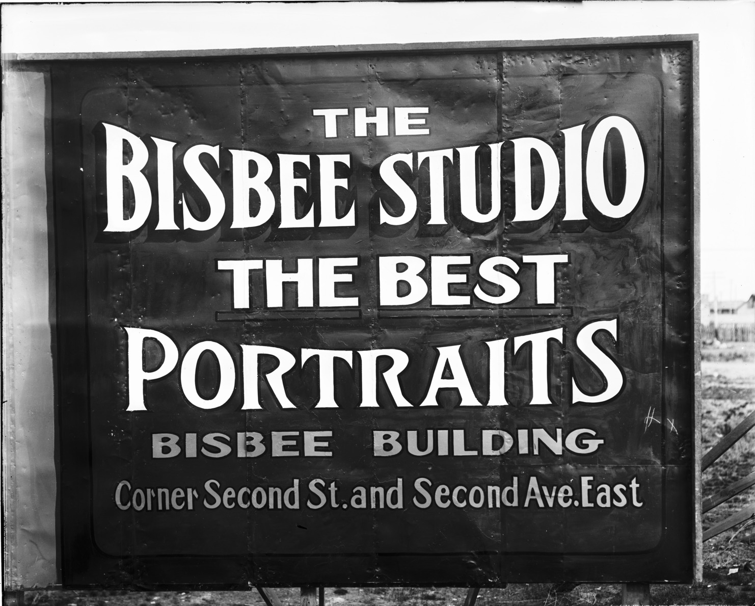 A Bisbee Studio advertisement on a signboard. It reads, "The Bisbee Studio; the Best Portraits, Bisbee Building; Corner Second St and Second Ave East."
