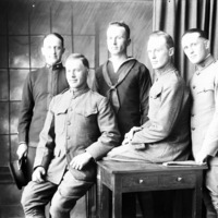 - Portrait of five men in military uniforms.