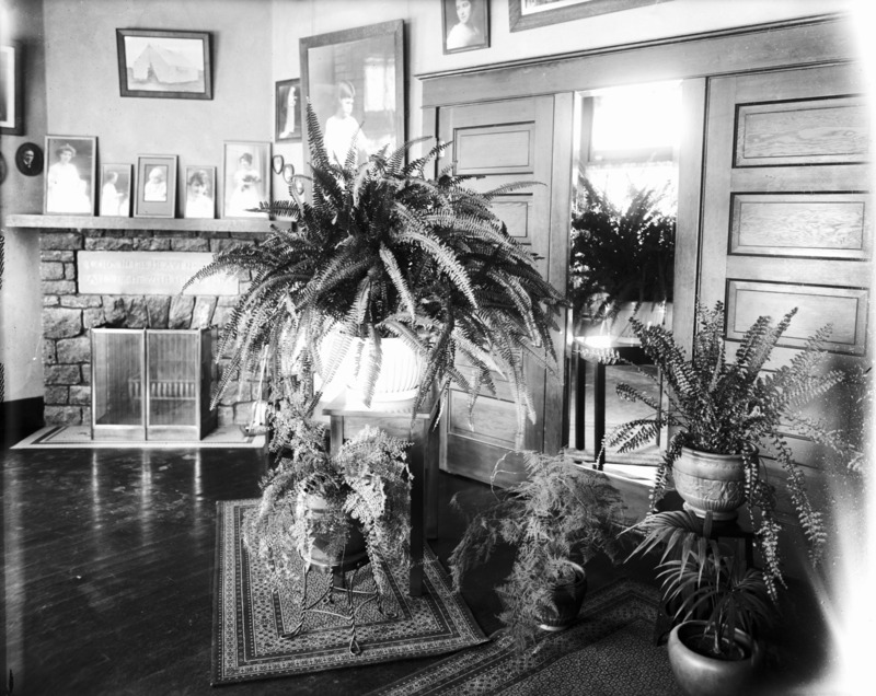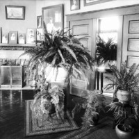 - Interior of the Bisbee Studio; main room decorated with ferns and other plants.