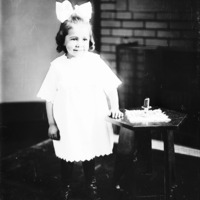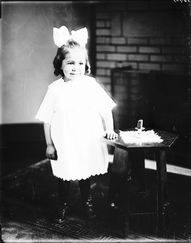 - Portrait of a young girl, a large bow in her hair, standing beside a table with a candle.