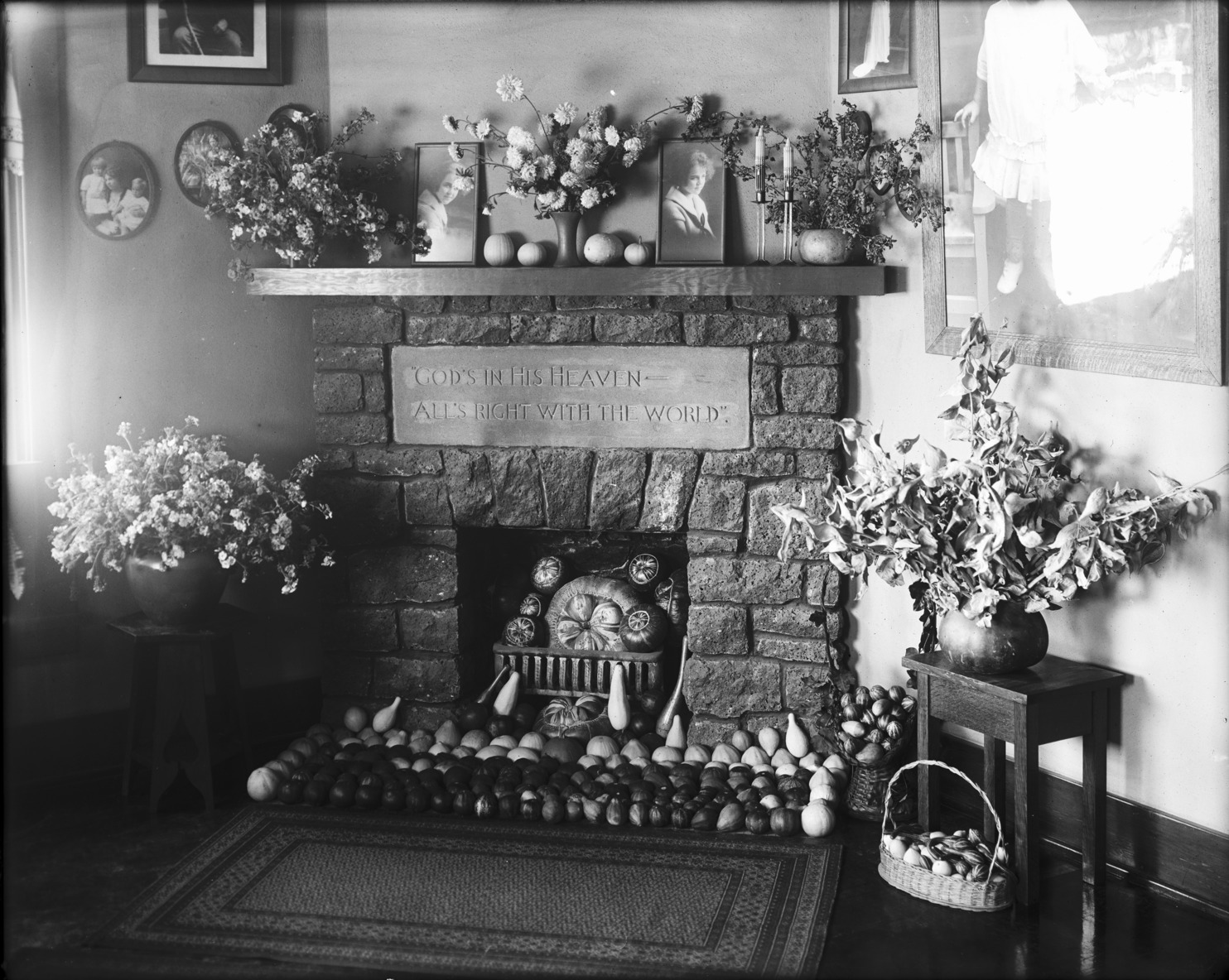 - One of the fireplaces in the Bisbee Studio. An embedded epigraph reads, "God's In His Heaven - All's Right With The World."