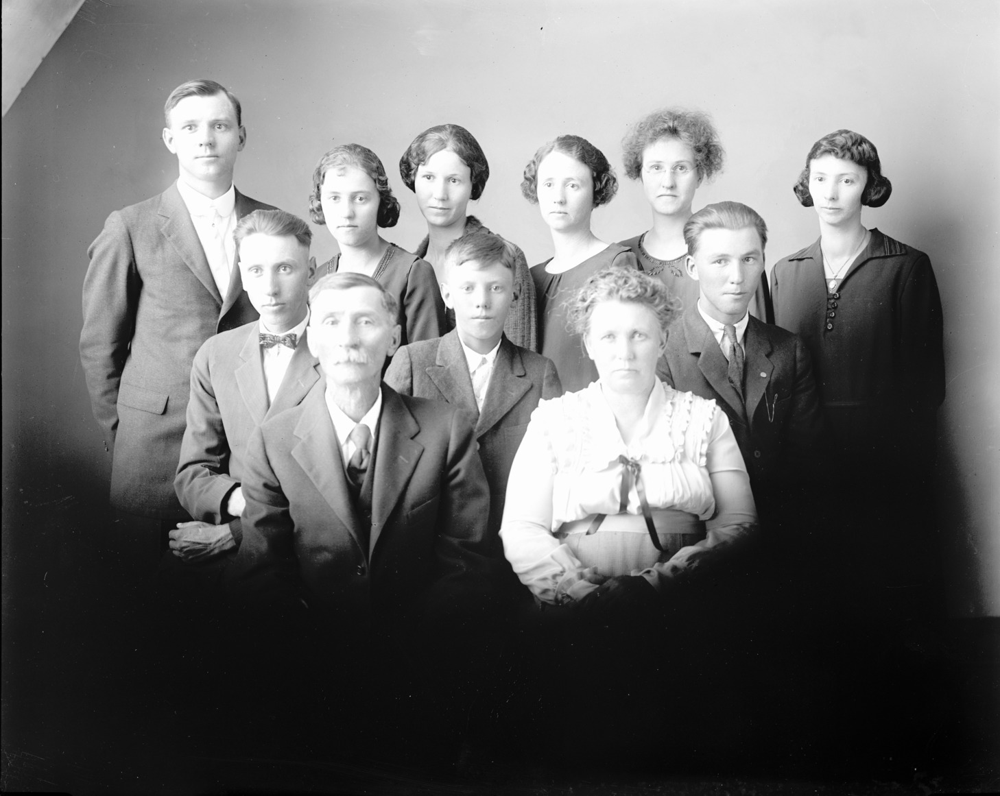 Portrait of a family with one woman, one man, four boys, and five girls.