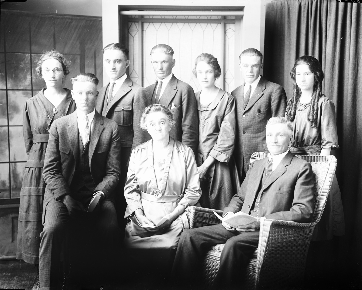 - Portrait of a family with one woman, one man, three young women, and four young men.