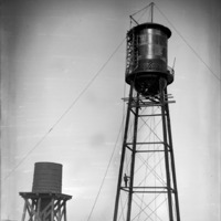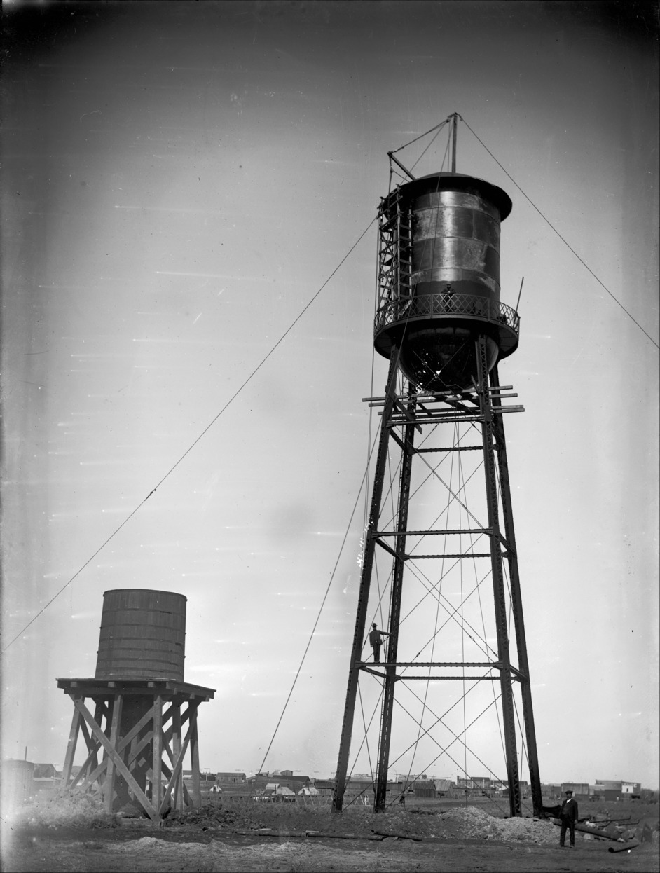 Water towers (tanks) for Twin Falls; one man stands on the structure, with one man below. Townsite buildings visible in background.