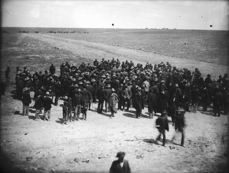 - A large group of men standing in a field; horses and/or cattle and a townsite in the distance.
