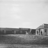 - Two men standing in front of the Filer Coal Company office; Oregon Short Line railroad cars in the background. Another sign reads, "Filer Coal Co. Rock Springs Coal.: