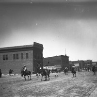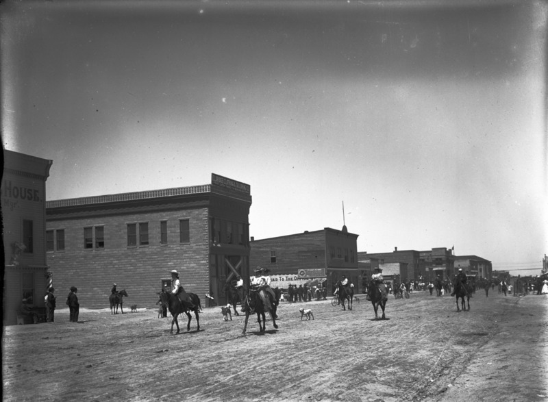 - A parade on Main Ave, extending from Hall House to the Perrine Hotel. Other visible signs include "Eldridge Clothing & Tailoring Co. - Everything for Man and Boy" and "Becker's Beer."