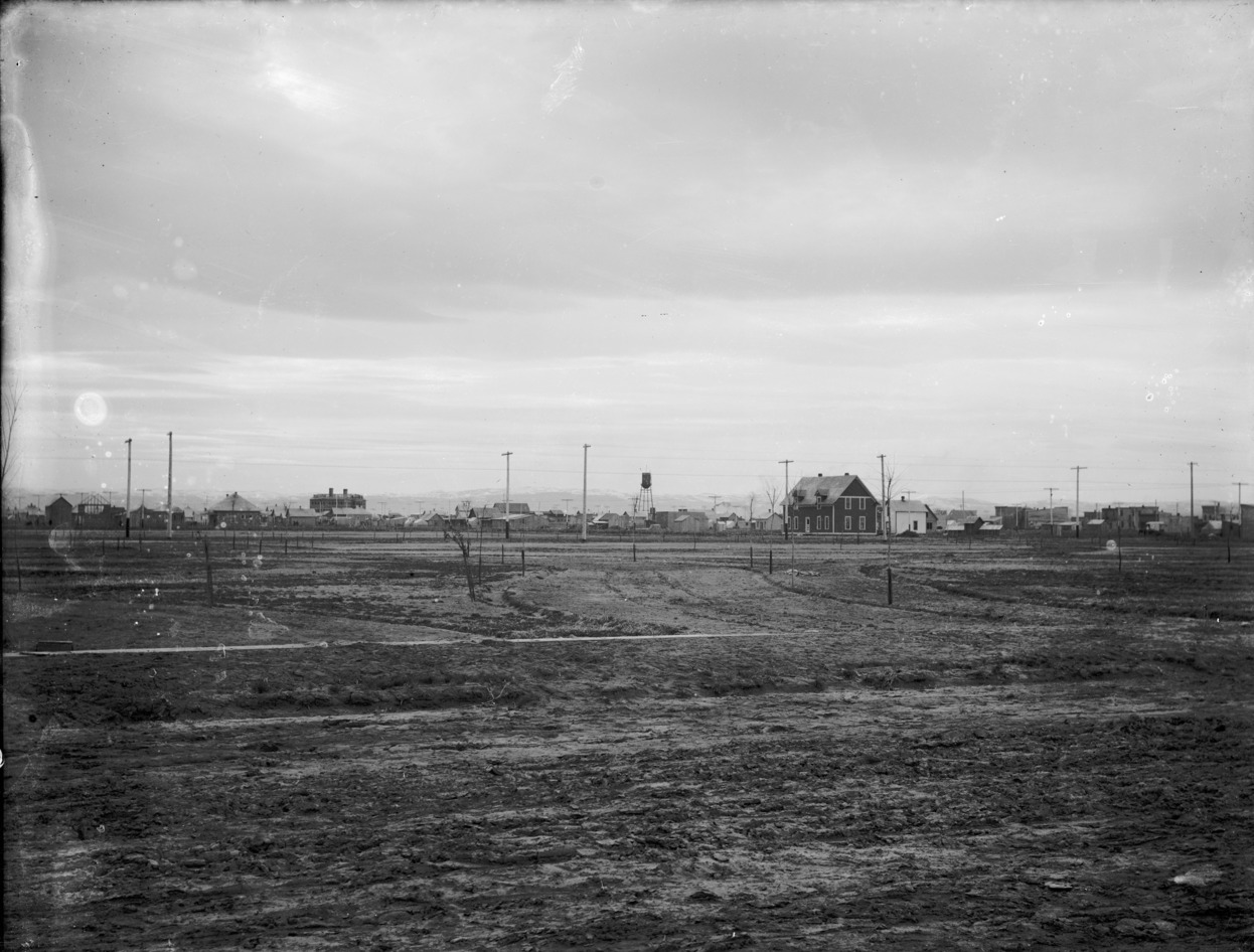 - A wide view of early Twin Falls, looking south. The large building on the center left is Bickel School, under construction.
