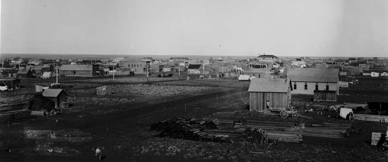 - A wide view of early Twin Falls, looking west, visible buildings include the Hall House and the Hotel Perrine.