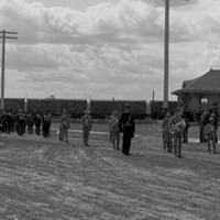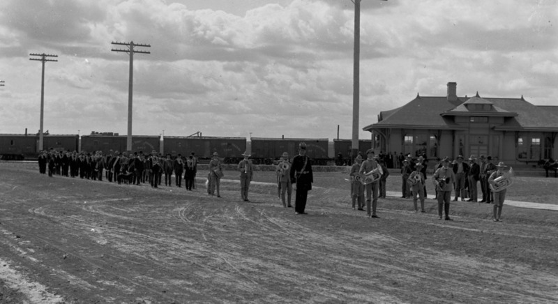 - A parade with a band and other marchers wearing regalia, in front of the Oregon Short Line Railroad Depot building.