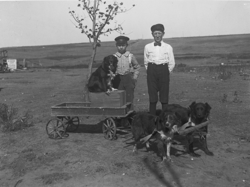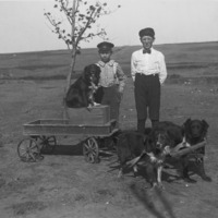 - Two boys stand in a farmyard behind a small wagon being pulled by two dogs and a third riding.