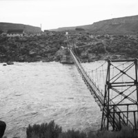 - A suspension bridge over the river near Auger Falls, near where Rock Creek joins the Snake River; buildings on the opposite bank.