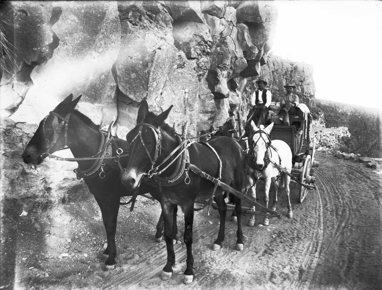 - Two men seated on a stagecoach pulled by a team of four horses, descending a road into the canyon.