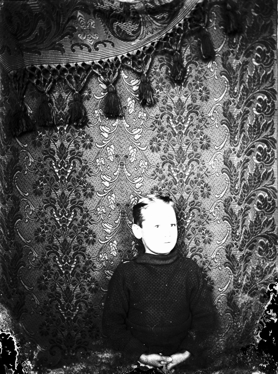 - Portrait of a boy posed before a tapestry.