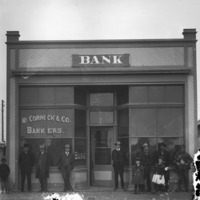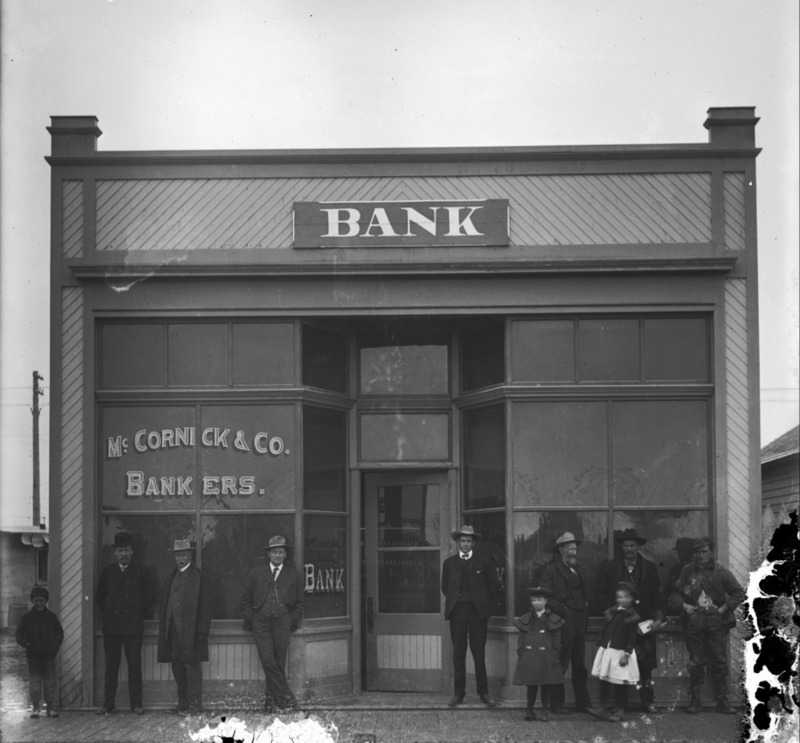 - Several people standing on the sidewalk in front of the McCornick and Company Bank Building.