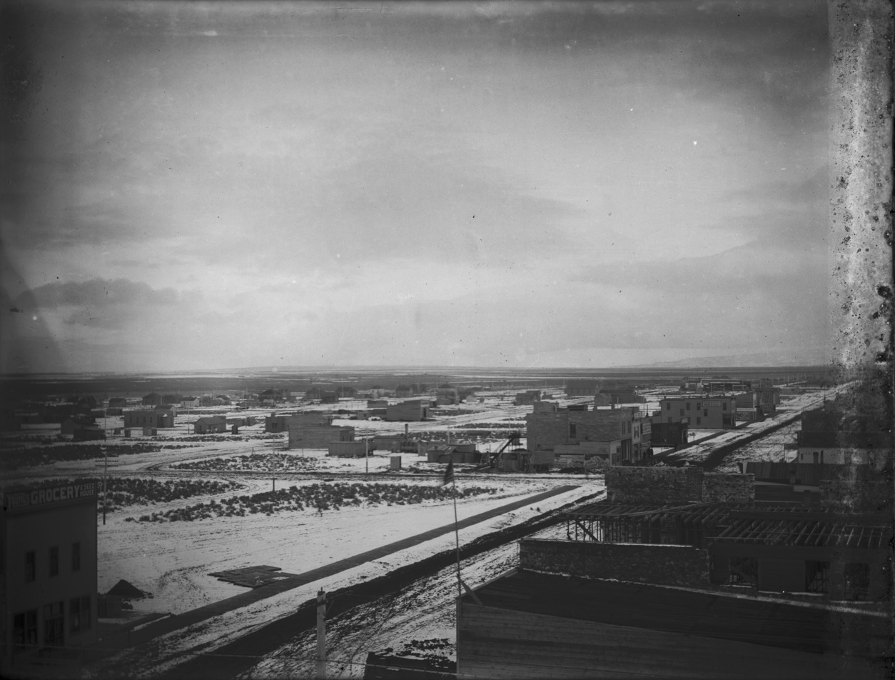 - View of early Twin Falls townsite showing streets and new construction; likely taken from atop the Hotel Perrine. Visible signs are Young's Grocery and Seed House (bottom left) and Burrington Hotel (middle right).