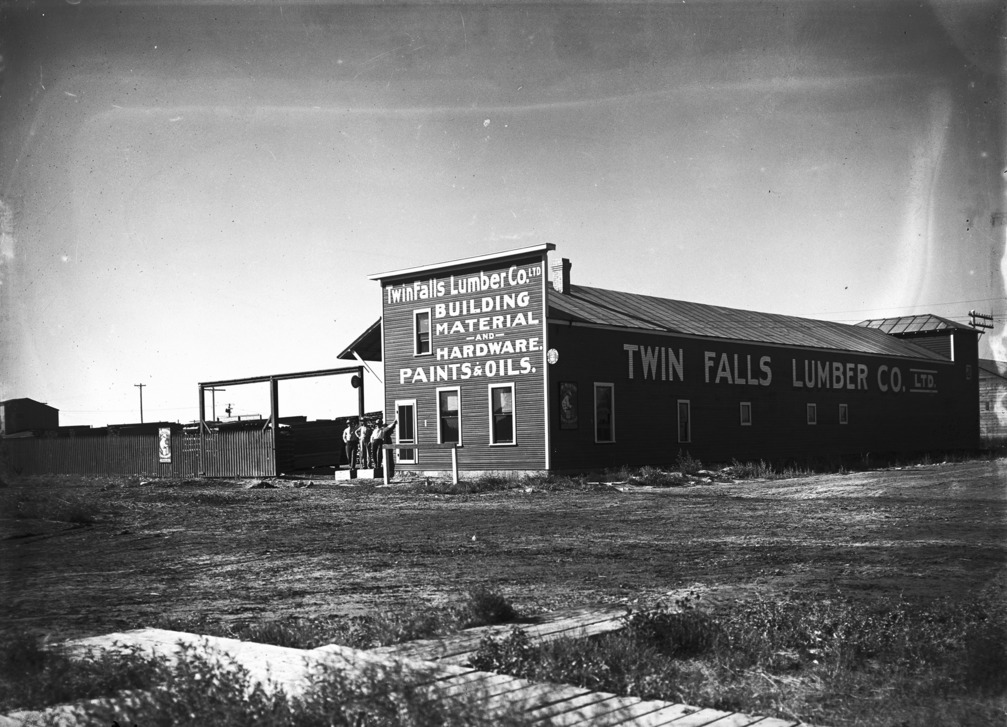 - Twin Falls Lumber Company Ltd building and yard. Three men stand near the entrance. The front of the building reads, "Twin Falls Lumber Co, LTD; Building Material and Hardware; Paints and Oils.