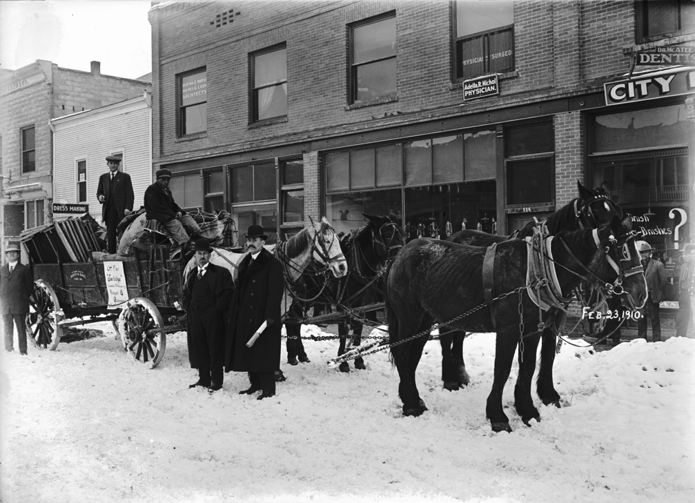 "Feb 23, 1910;" Men, a team of horses, and a freight wagon stand in the snow in front of the Boyd Building. A sign on the wagon reads, "Off for 'Jarbidge' - Loaded and Packed by Meyer and Company Outfitters." Other businesses and buildings visible are Dr McAtee, Dentist; Adella R. Nichol, Physician; Burton E, Morse and Holmes G. Lash, Architects;
