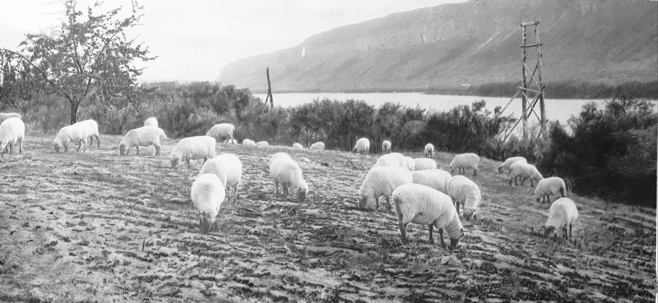 - Sheep graze on a bank of a river.