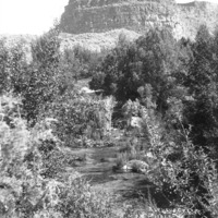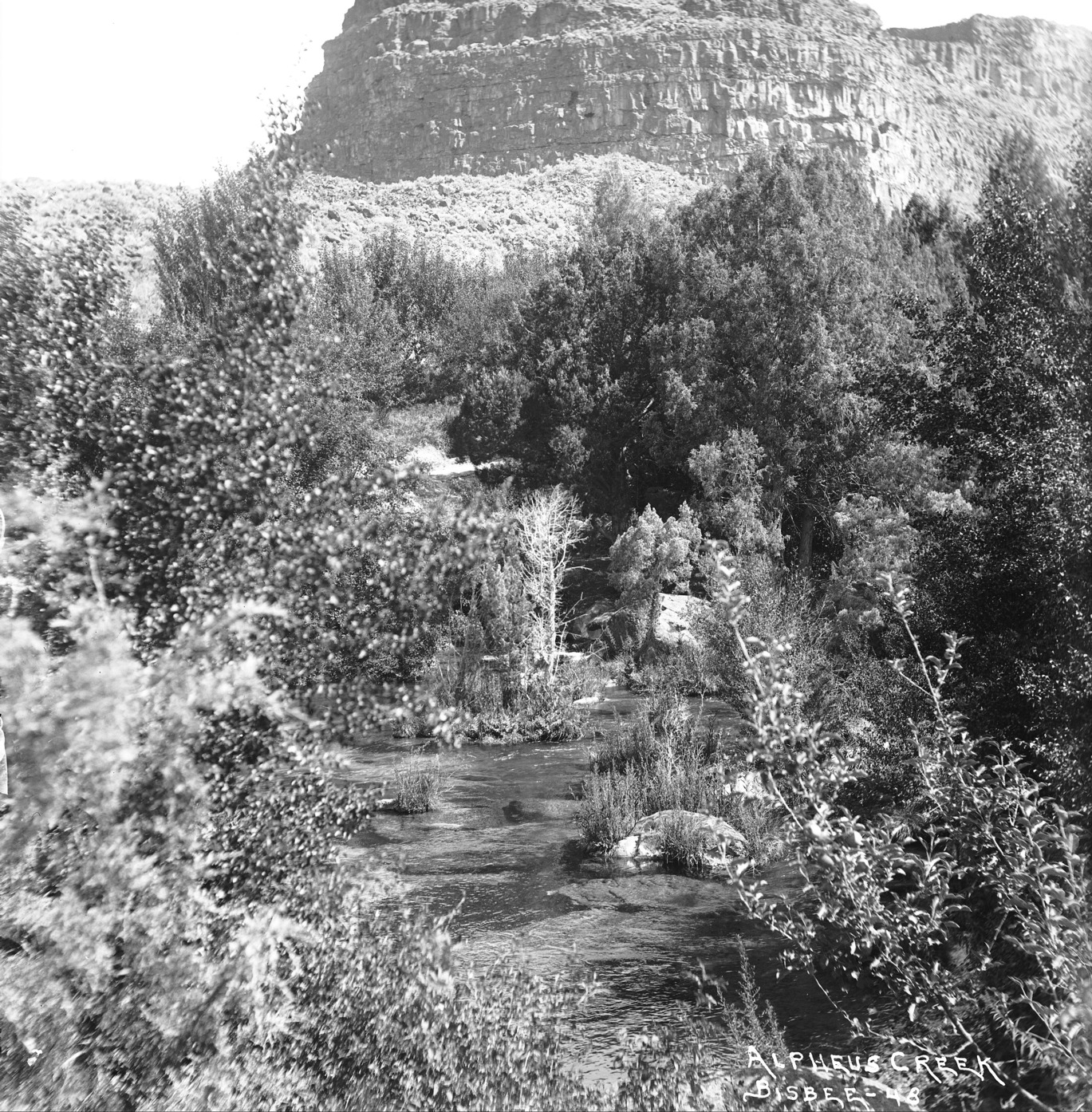 - "Alpheus Creek;" creek with canyon wall in the background.