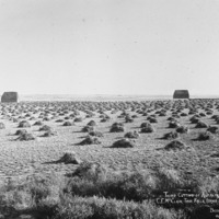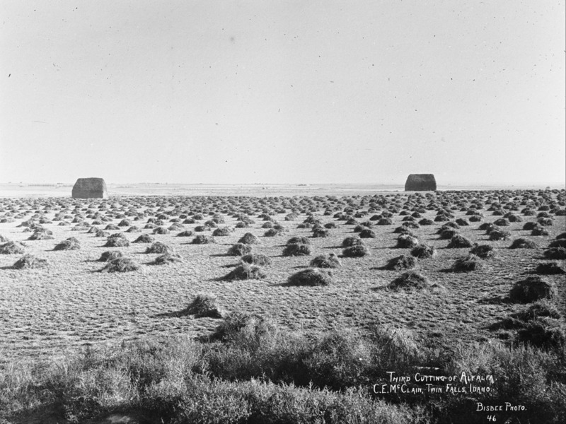 - "Third cutting of alfalfa. C.E. McClain, Twin Falls, Idaho;" field with small piles of alfalfa. Two large stacks of hay/alfalfa in the background.