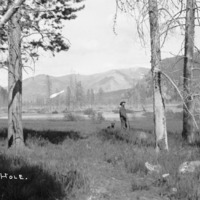 - "Jackson Hole;" a hunter and his dog stand among trees with foothills in background
