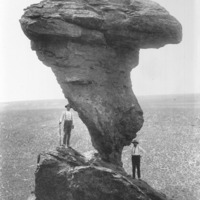 - "Balance Rock; Copyright 1908; C.E. Bisbee; Twin Falls, Idaho;" two men stand at the base of Balanced Rock