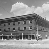 - "Hotel Rogerson; " view of the hotel from the corner of Main Ave E and 2nd St E (now Hansen St E); the road is unpaved, and a horse stands at the corner.