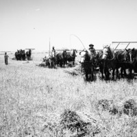 - Three men managing teams pulling a reaper-binder; two other men stacking sheaves in a grain field
