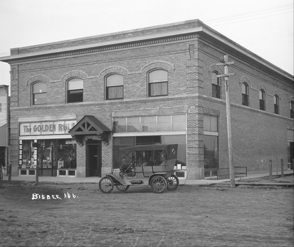 - The Golden Rule store; automobile parked in front on unpaved street.