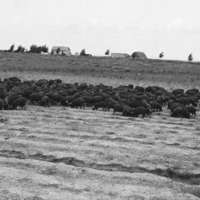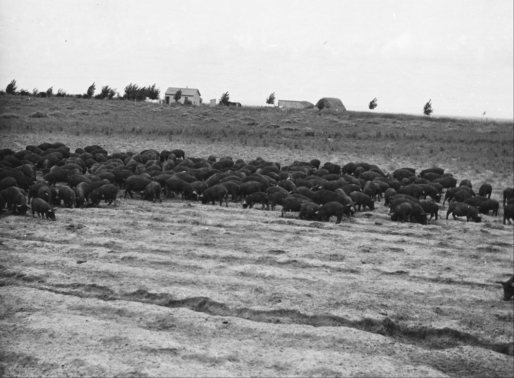 - A herd of pigs eat in a field; a house, outbuildings, and hay stack in background.