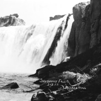 - "Shoshone Falls, 212 ft;" view of Falls from river