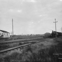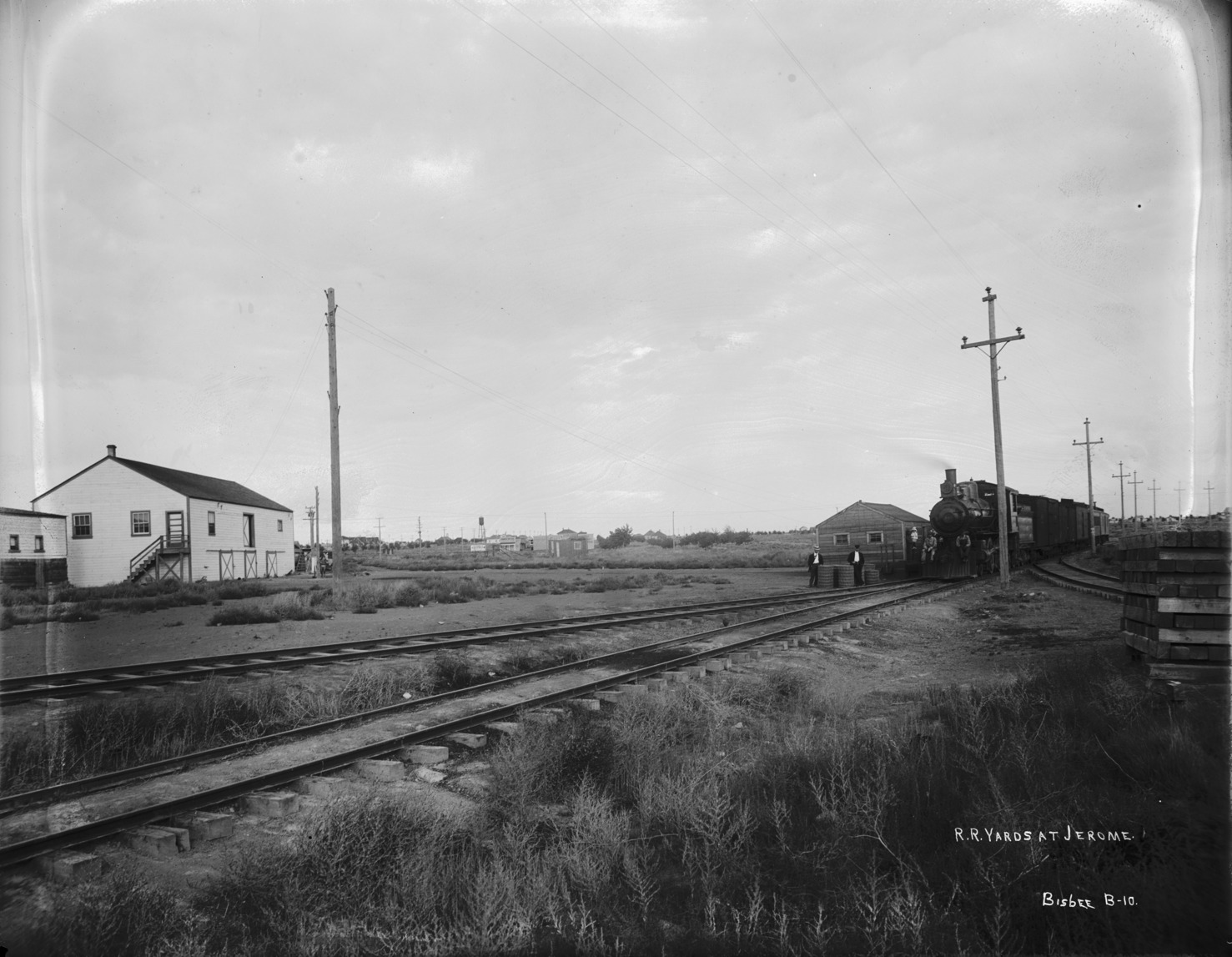 - "Railroad yards at Jerome;" train, with people posed at the front of the engine, in the Jerome railroad yard; several buildings in the background