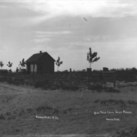 - "One Year from Sage Brush; North Side;" a farmstead with a small house, and fenced area lined with trees; four people, two men, a woman, and a child, stand in the yeard beside the house