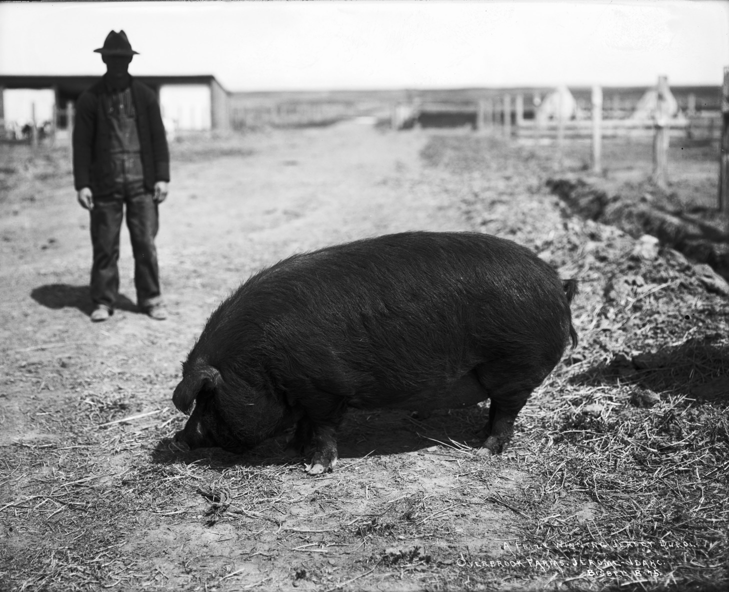 - "A prize winning Jersey Duroc; Overbrook Farms, Jerome, Idaho;" a man stands behind a large pig