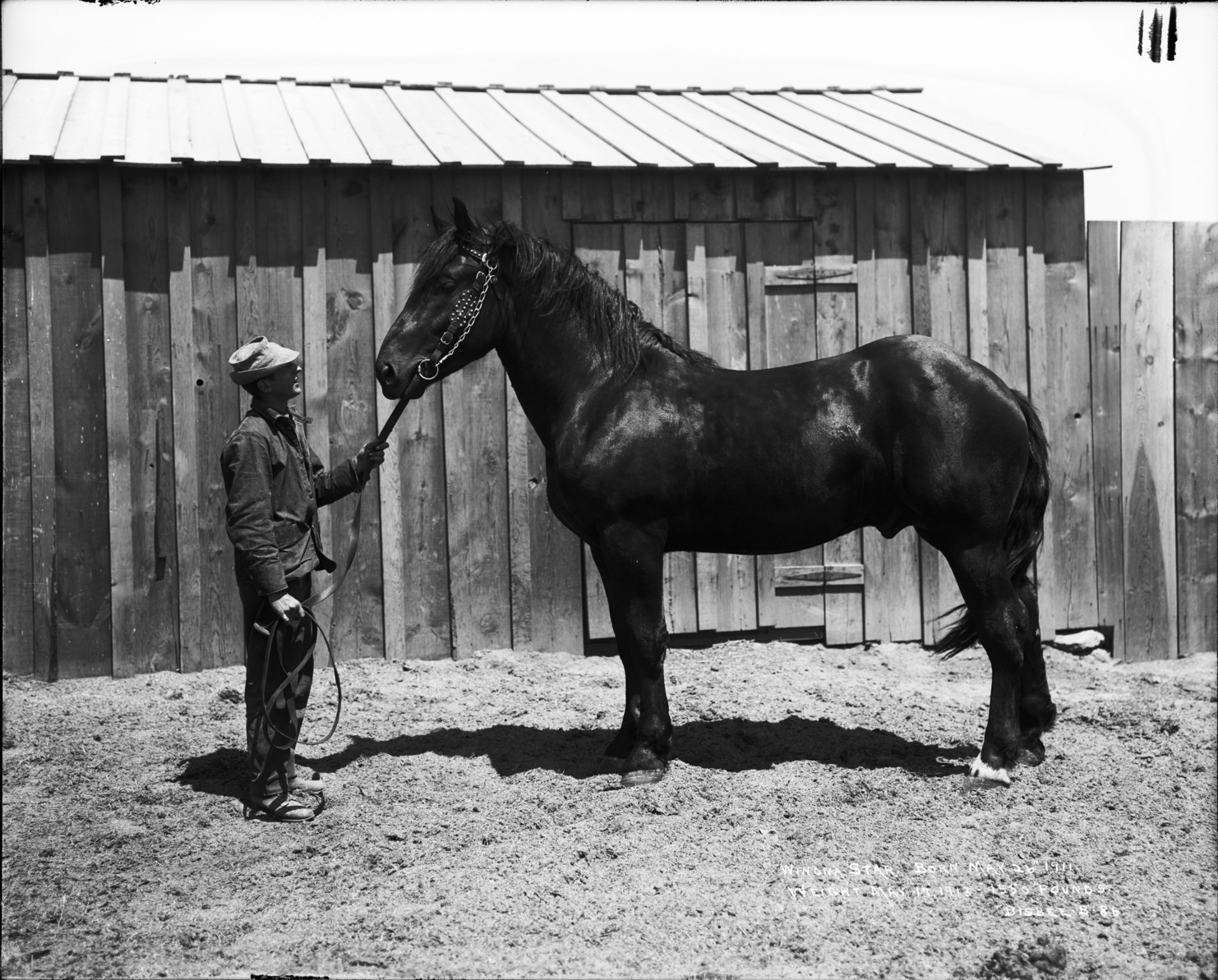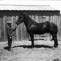 - "Winona Star, Born May 26th, 1911; Weight May 17, 1913 - 1,550 pounds;" a man holds the reins of a horse in front of a wooden barn.
