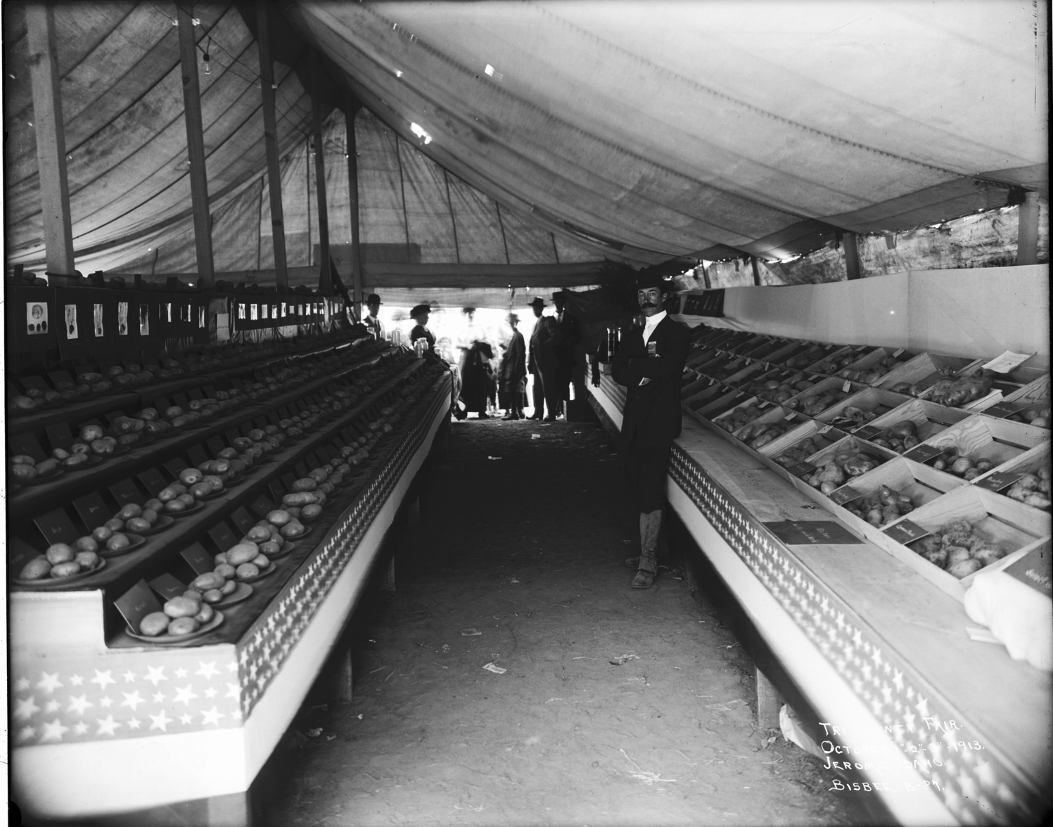 - "Tri-County Fair; October 1,2,3, 1913; Jerome, Idaho;" several people stand near a produce display in a large tent