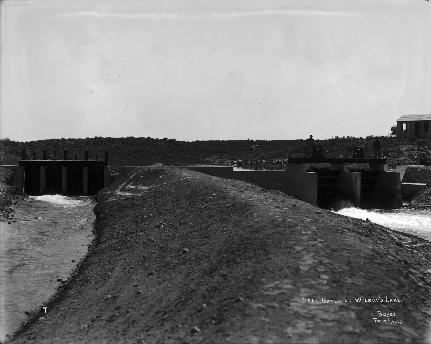 - "Head Gates at Wilson's Lake;" view along berm beside gates of North Side; a man stand at the gates; a building in background at right