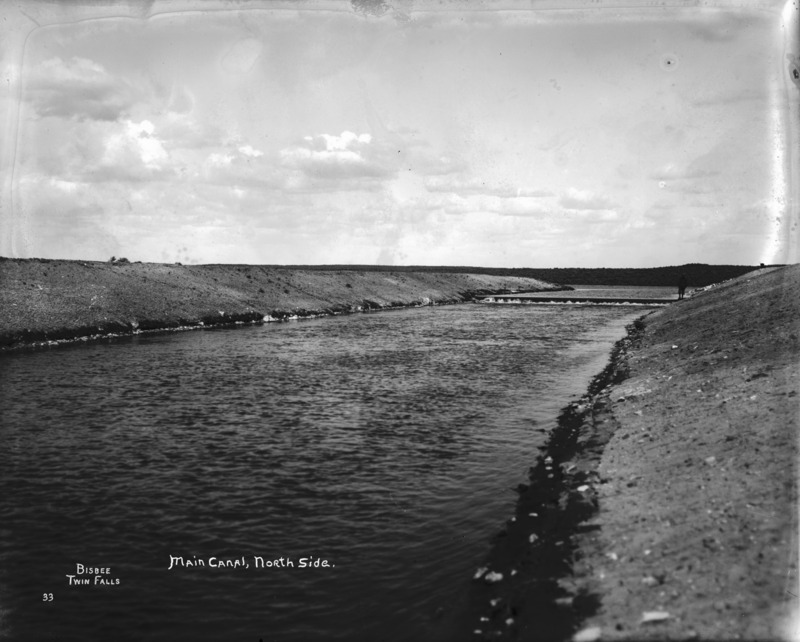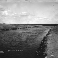- "Main Canal, North Side;" a look down the canal; a man stands on the right of the canal in the background