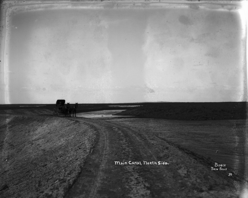 - "Main Canal, North Side;" two horses and buggy stand on the berm along the canal