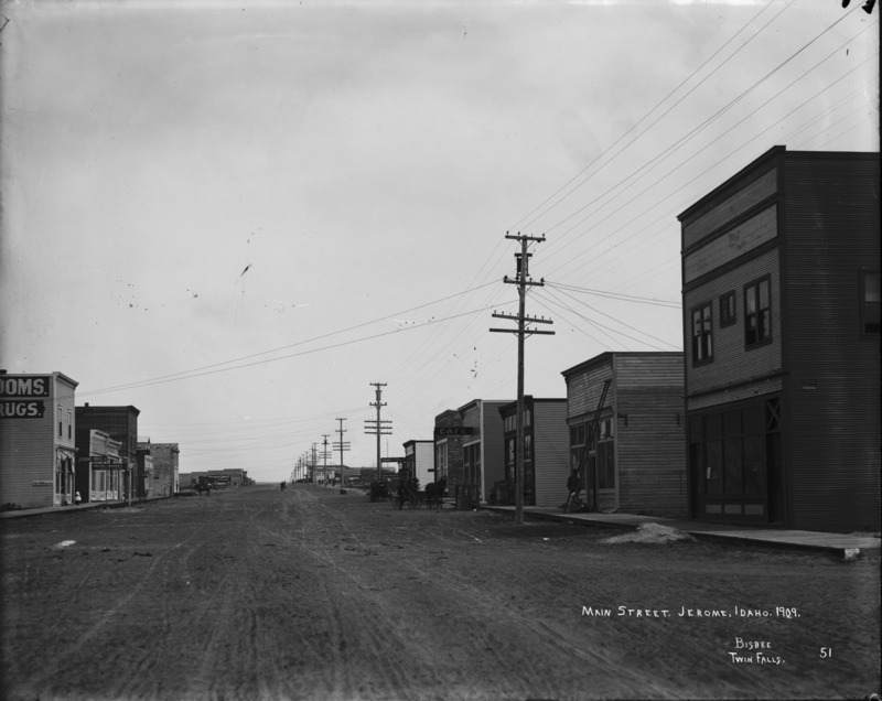 - "Main Street, Jerome, Idaho, 1909;" view down the street. Visible businesses include: Jerome Drug Co; Owens and Kinney, Civil Engineers and Surveyors; Stroud-Sprague Realty Co, Ltd; Haddock Land Co; Hardwick & Co. Real Estate; and also cigar and tobacco seller and cafe.