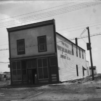 "Jerome, Idaho;" the Twin Falls North Side Land and Water Compnay and Investment Company, Ltd. Building. A woman stands in the doorway, speaking to a man.