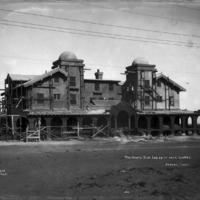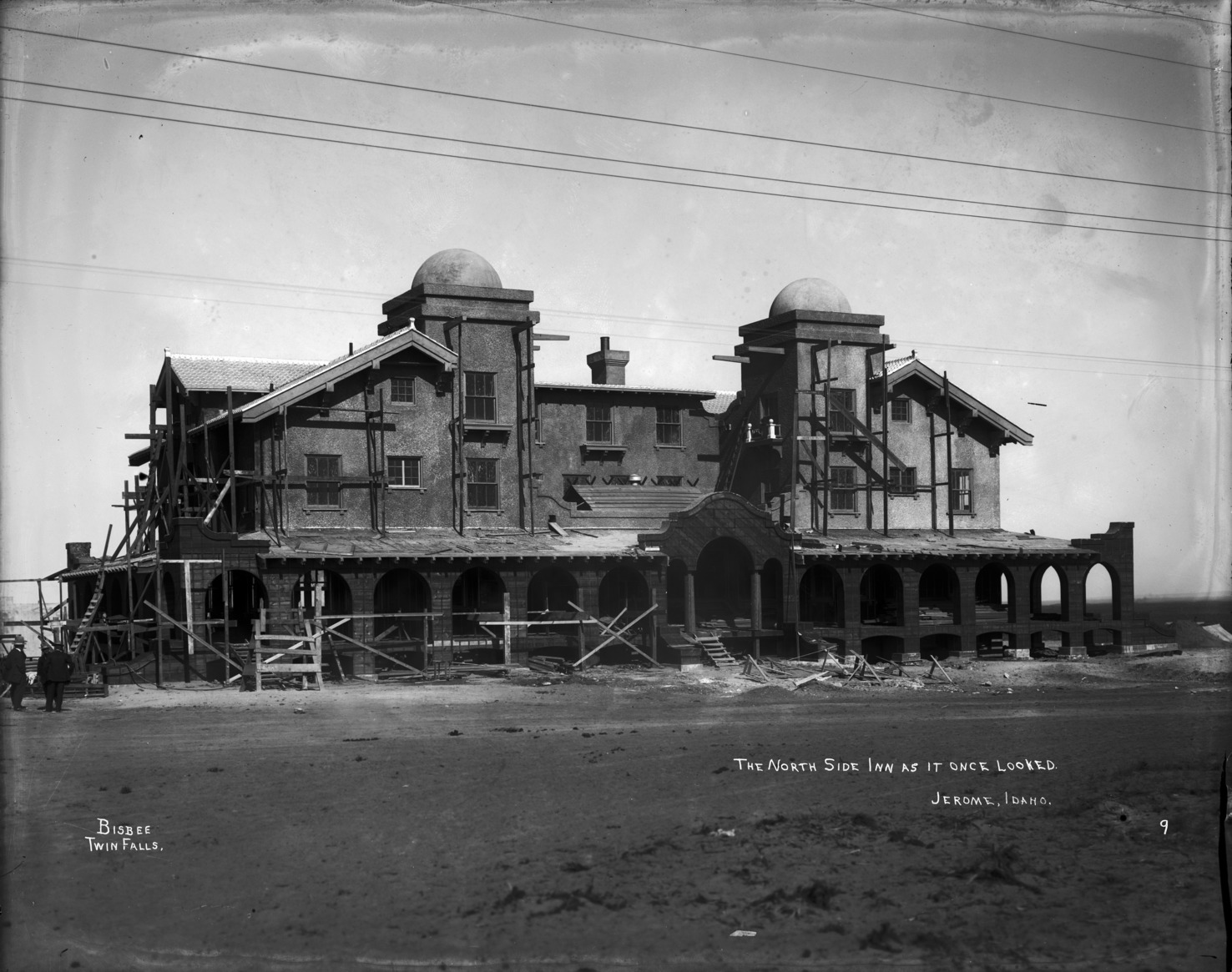 "The North Side Inn As It Once Looked; Jerome, Idaho;" view of construction on the Inn, three men stand on the very left