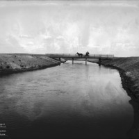 - "Main Canal; North Side;" a horse and buggy stopped on a short bridge over a canal.