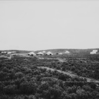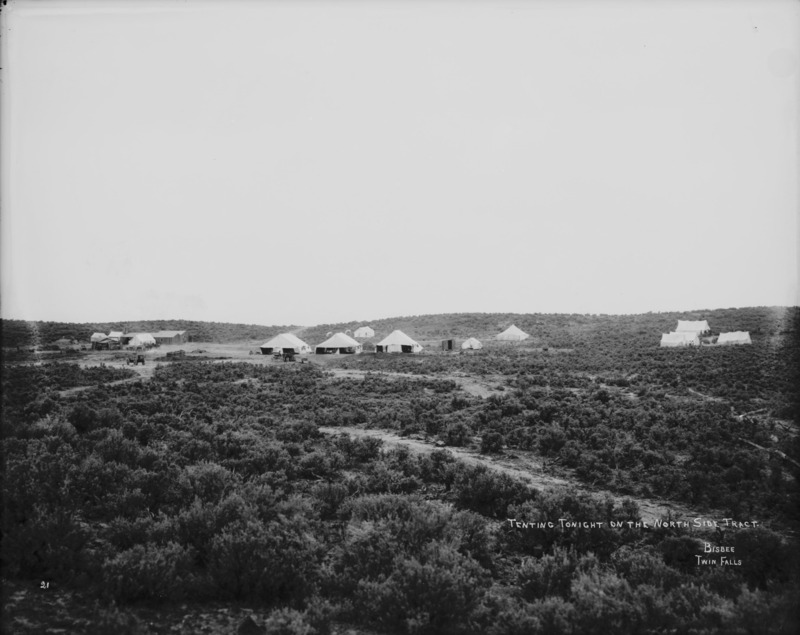 - "Tenting Tonight on the North Side Tract;" several canvas tents and a few wood frame buildings nestle among the sage brush