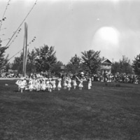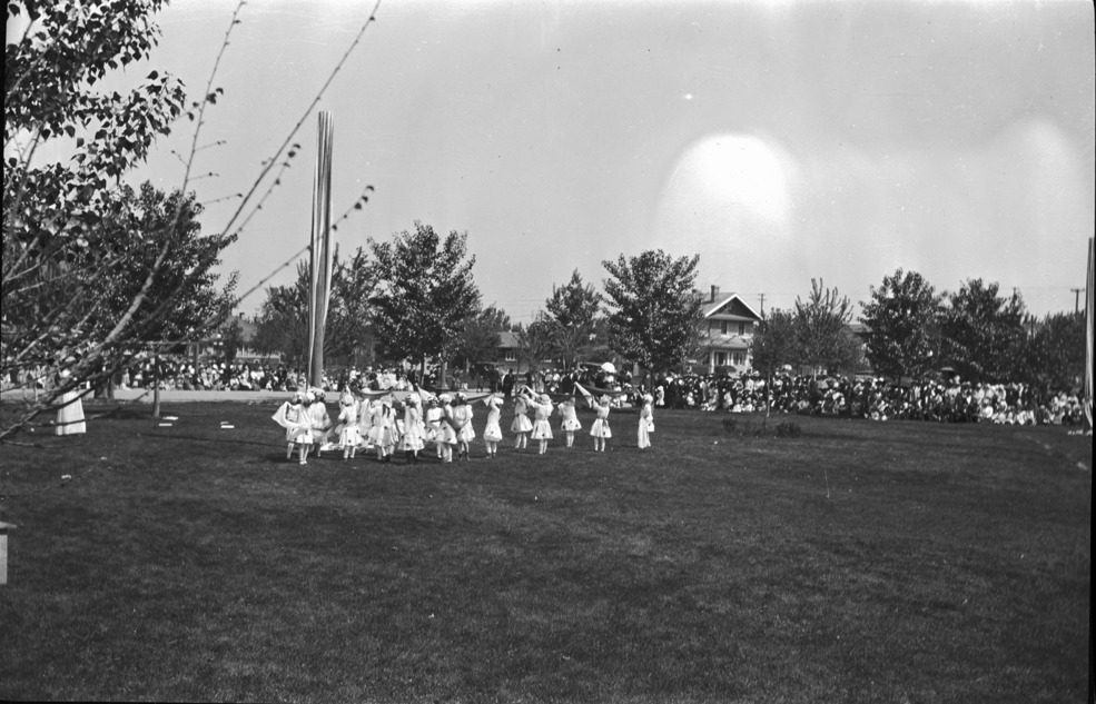 - Several young girls dressed in white gather with ribbons around a maypole on May Day in Twin Falls City Park; several houses in background.