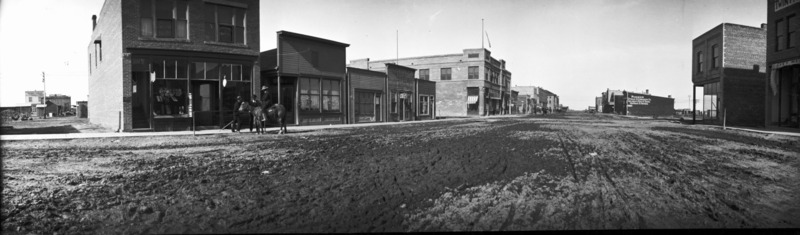 Panoramic view of Main Ave, looking northwest. A man on a horse speaks with two men standing on the wooden boardwalk Visible businesses and buildings include: The Hub; Dr. F.W. Pike; Star Restaurant; Sweeley and Sweeley; Idaho Department Store; Bedford Drug; Boyd buidling; Hotel Perrine; Eldridge's Clothing Store; Pioneer Storage and Commission Co. Two businesses in background on what is now 2nd Ave S one is Berry and Swank Plumbers and Tinners.