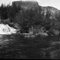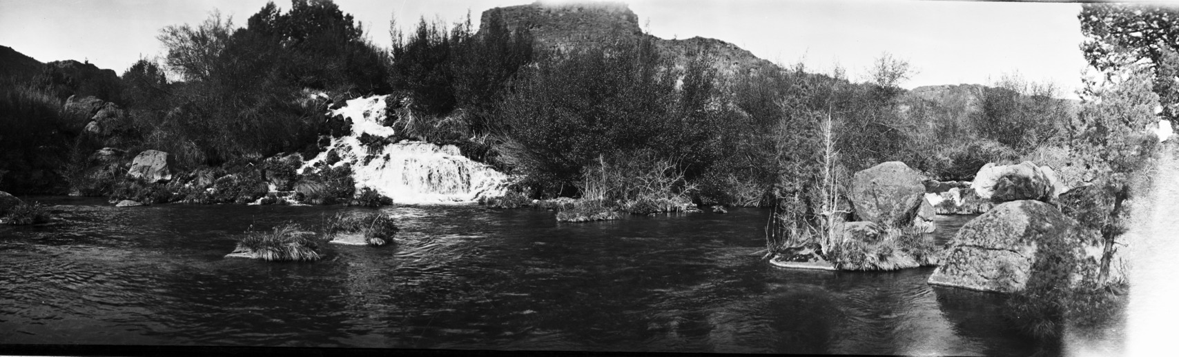 - Panoramic view of Alpheus Creek, with Snake River Canyon walls in background.