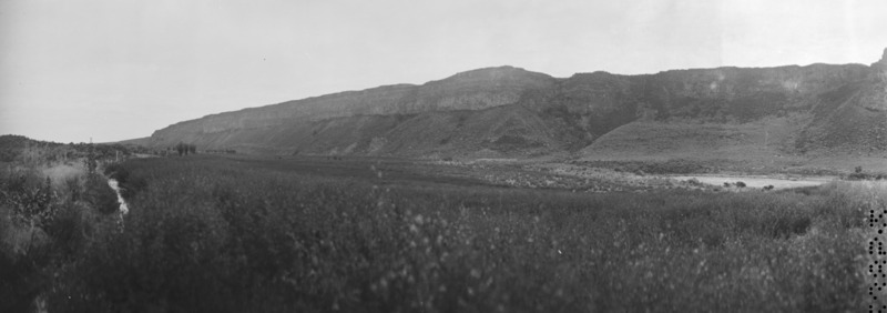 - Panoramic view of a field at the bottom of a canyon; a large dirt ditch on left.